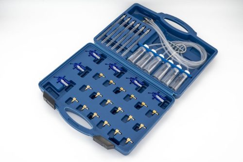 24pc professional common rail diesel injector flow meter and adaptor set to measure return fuel flow on each injector. Specially designed to help identify blocked, clogged, damaged or worn (not working) Bosch, Delphi, Denso or Siemens diesel injectors. Set includes measure tubes for quick test, measure bottles for more accurate test and different type adaptors to connect injectors. Suitable for up to 6 cylinders diesel engine fitted with common rail and non-common rail injection system. Supplied in carry case.