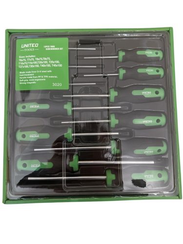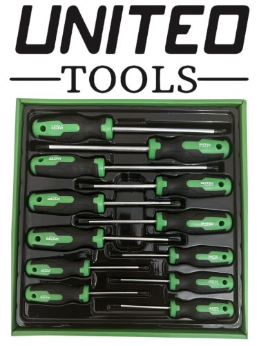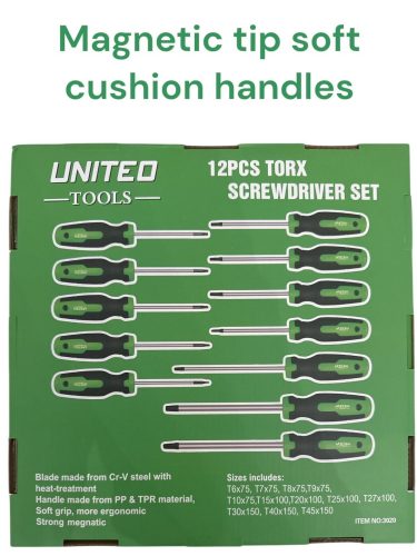 The Magnetic TORX Screwdriver Set by United Tools includes 12 pc set with soft cushion grip handles and extra strong magnetic tips The set features a variety of star sizes from T6 to T45, with different lengths available including 75mm, 100mm, and 150mm. The screwdrivers have a Torx drive type and come in a green and black colours 1-year manufacturer warranty dispatch the very same working day forwarded before 3 pm dispatch with full tracking details